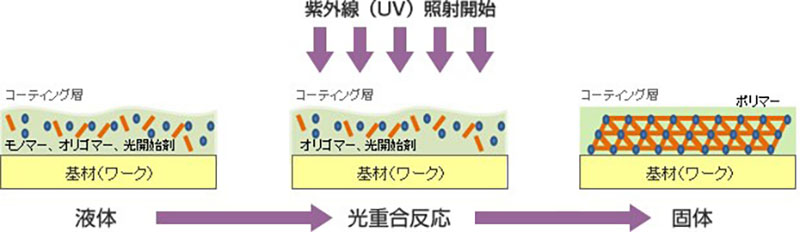 UV(紫外線)硬化樹脂とは、紫外線(200~400nm)の光エネルギに反応して液体から固体へ化学的に短時間で変化する合成樹脂です。