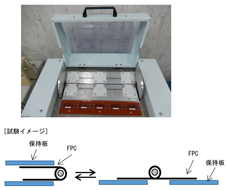 2枚の平行板の間で、屈曲させたFPCを固定し、一方の板を往復運動させることによりFPCを屈曲させます( JIS 準拠)。