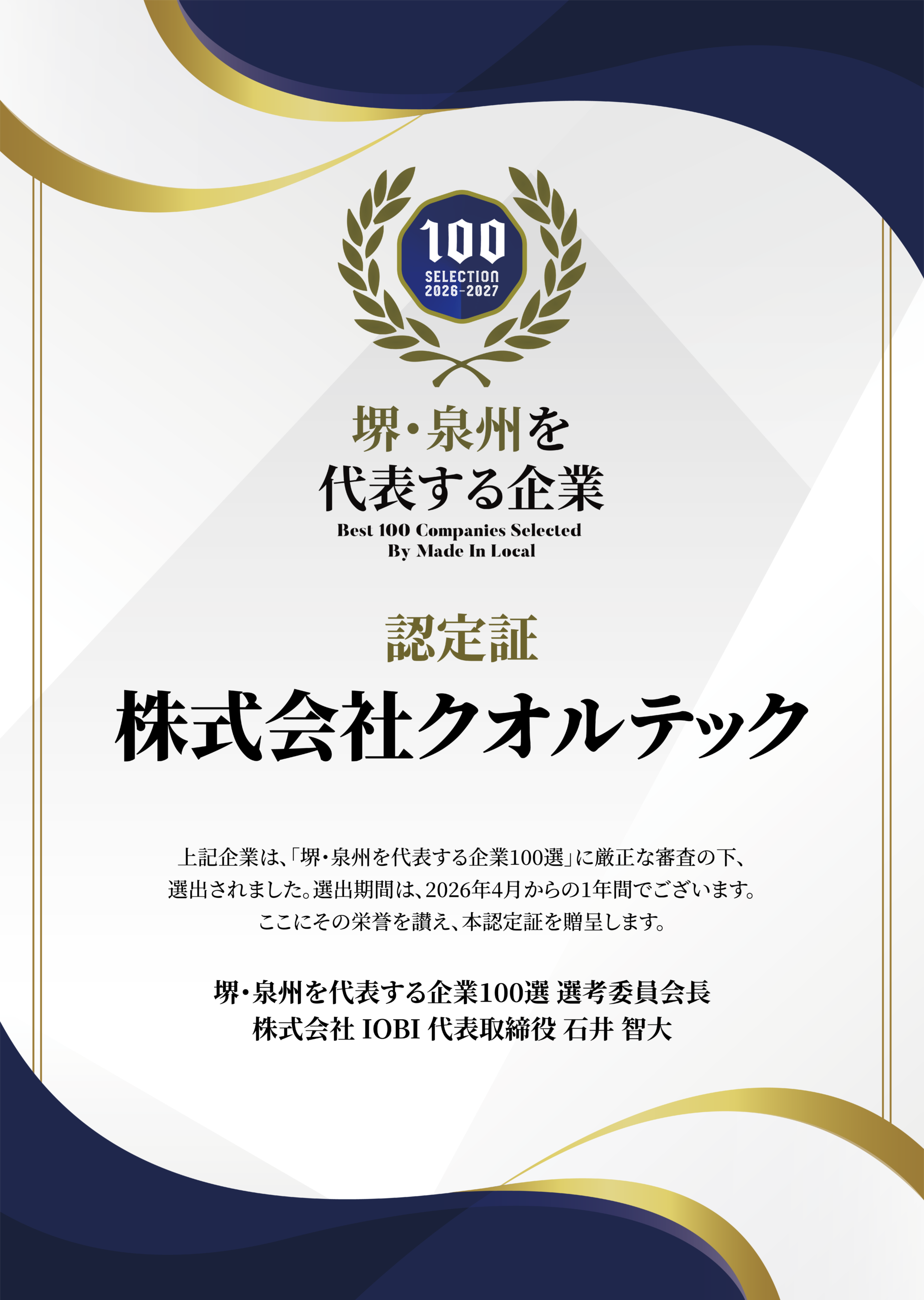 クオルテックは2026年4月1日「堺・泉州を代表する企業100選」に3年連続、選出されました。