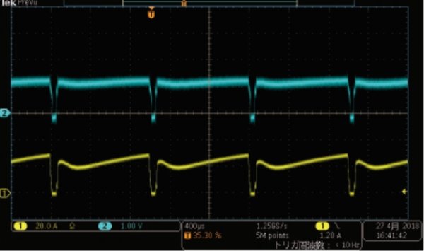 上のグラフはTO-247を使用。黄色が電流、青が電圧です。