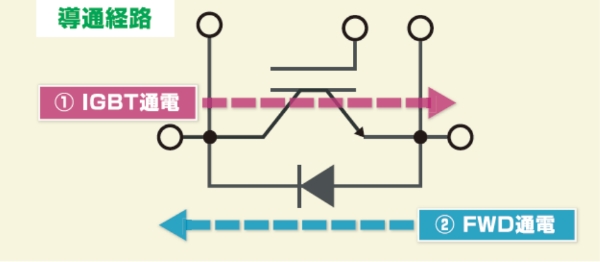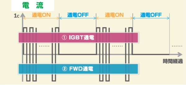 パルス通電のノウハウを駆使し、IGBTとFWDを交互に通電させることで、より実動作に近い環境を擬似的に構築しました。その他メリットとしてIGBTとFWDのタイムシェアリングによる効率的な評価が可能です。